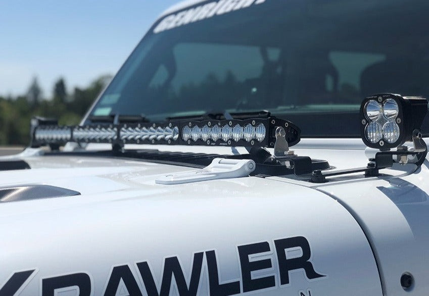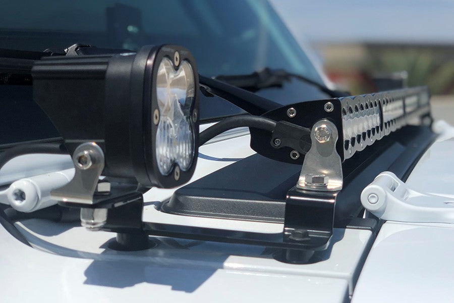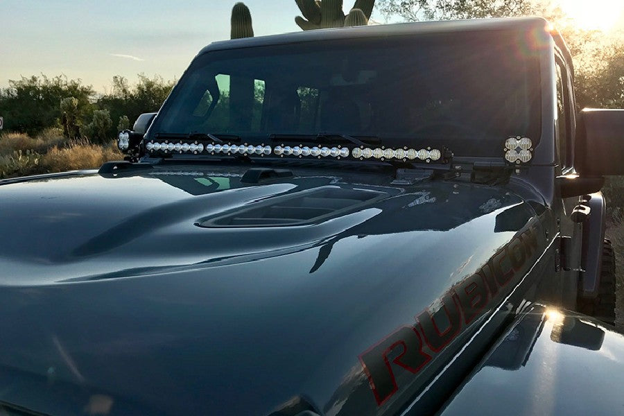 This is a serious light set up for people who take playing in the outdoors seriously. The Baja Designs Jeep JL / JT Gladiator Cowl Mounts are the ultimate mounting option for anyone that wants versatility. This bracket can mount one pair of Squadron series lights with a 40-inch S8 light bar. This package includes two Squadron Sports that each feature four Cree LEDs to produce 3,150 lumens at 26 watts to produce crisp, clear light that pierces the darkness and improves visibility in any and all conditions. If that wasn’t enough, you also get a 40-inch S8 Light Bar. It pumps out 25,400 lumens of Cree LED power. It does so with a low amp draw to put less strain on your battery, too. A clean aluminum frame with scalloped housing, machined aluminum bezel, and stainless steel hardware protects the circuity from water or debris. The LEDs last nearly 50,000 hours while exceeding mil-spec testing for reliability, and the steel mounts are powder coated to last the life of your Jeep. NOTE: The cowl on the Mojave and 392 models is taller and requires longer M6 x 80mm flange bolts.