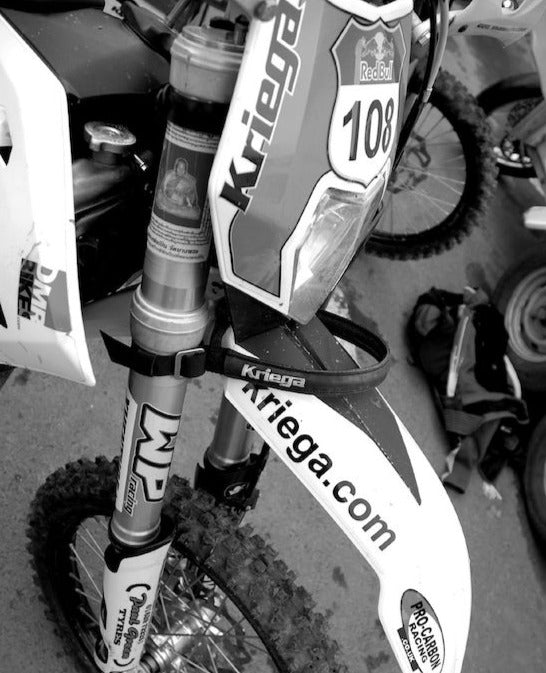 Front and rear fender straps are essential equipment for extreme Enduro events. Kriega’s unique design is a self supporting/semi-rigid solution, which is always easy to find and use regardless of how messy the conditions get.
